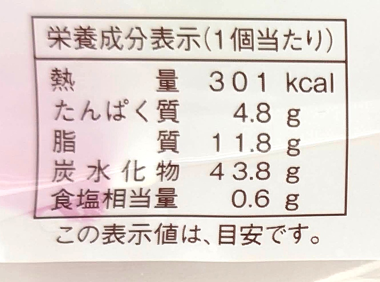 栄養成分熱量 301kcal、たんぱく質 4.8g、脂質 11.8g、炭水化物 43.8g、食塩相当量 0.6g (この表示値は目安です)